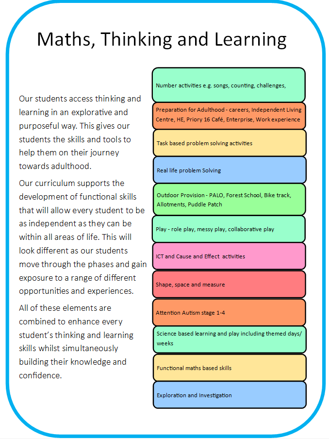 - · Access to HE room for real life functional skill sessions, measuring using cups, using different appliances and finding equipment.